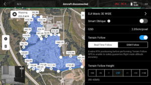 Terrain follow / DSM — jeśli teren jest nierówny, użyj funkcji śledzenia terenu (Terrain Follow) lub zaimportuj DSM, by utrzymać stałą wysokość nad powierzchnią.